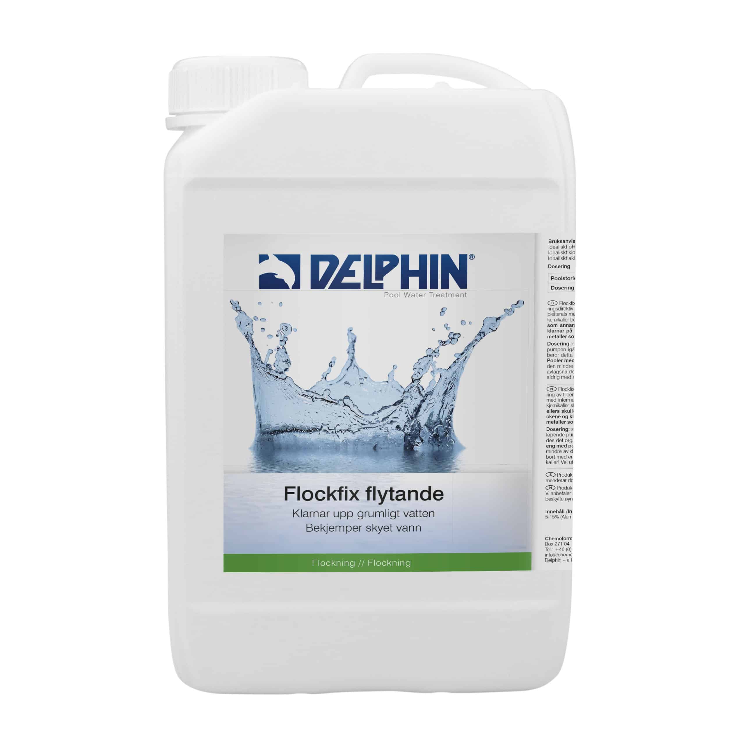 Användning: Blanda Flockfix Liquid med vatten i en hink och fördela jämt i poolen. Låt pumpen vara påsöagen i 24h och håva upp/dammsuga partiklarna som klumpat ihop sig. Backspola därefter sandfiltret.