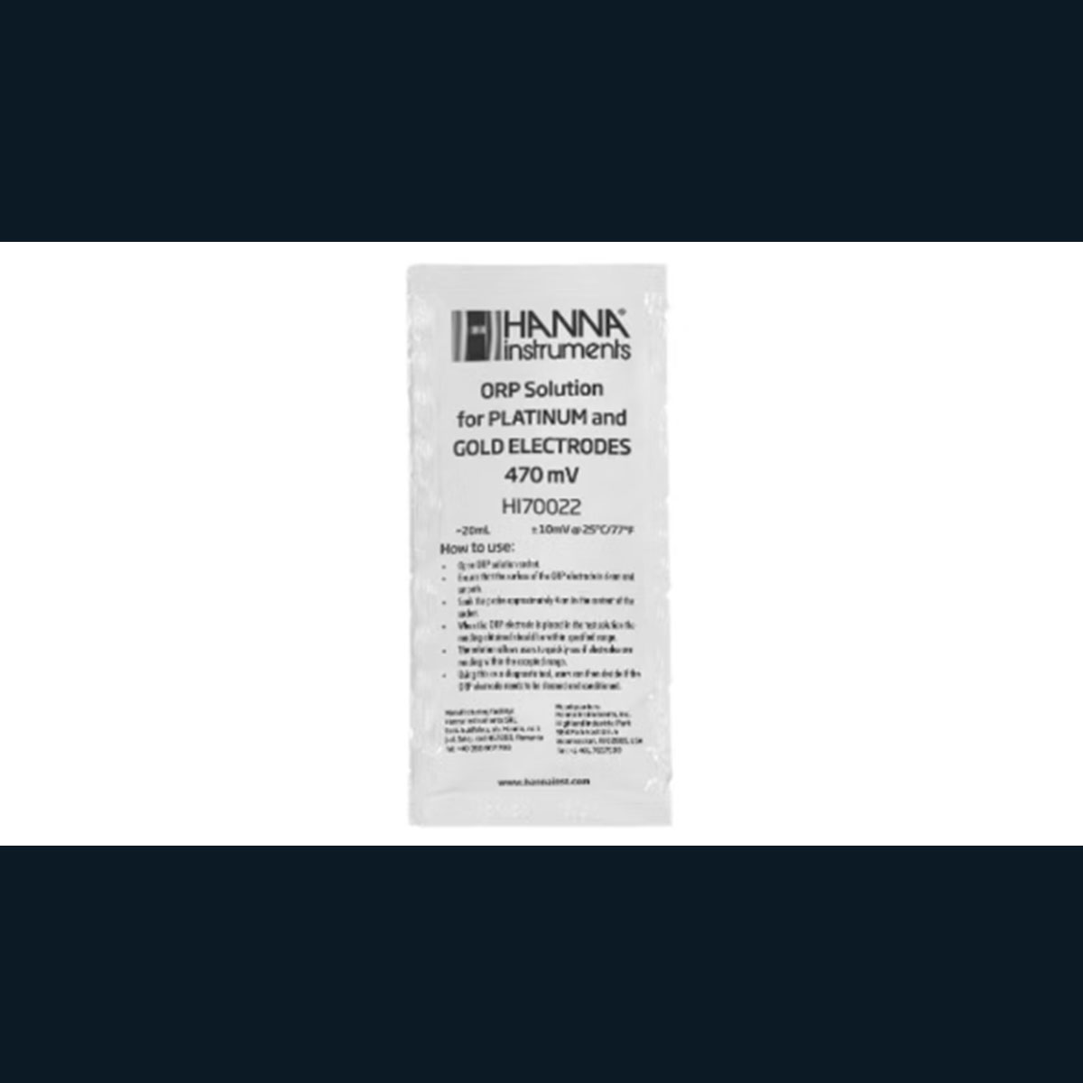 Färdigblandad buffertlösning ORP/Redox 470 mV i engångs påse på 20 ml. Används för kalibrering av ORP sensorer, för bästa noggrannhet på dina instrument.