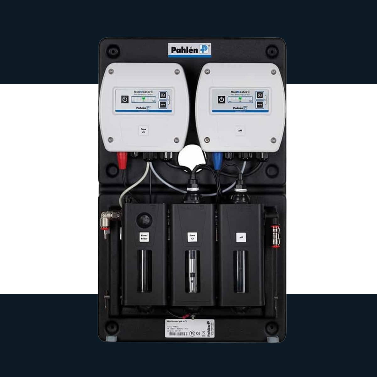 Fullt utrustad med alla tillval är MiniMaster en komplett mät-och doseringsenhet. pH-värdet mäts med hjälp av en pH-elektrod och klorvärdet med hjälp av en klorelektrod. Klara och tydliga LED-dioder visar statusen på din vattenkvalitet. Grönt indikerar optimalt värde, gult indikerar att det sannolikt är dags att dosera eller att doseringen har varit för stor. När lampan lyser rött är värdet för högt eller lågt och automatisk dosering kommer ske för att uppnå rätt värde.