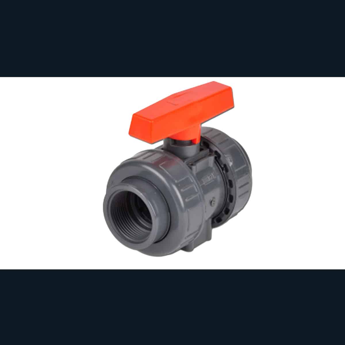 Kulventil i PVC med 1 1/2″ invändig gänga på båda sidor.