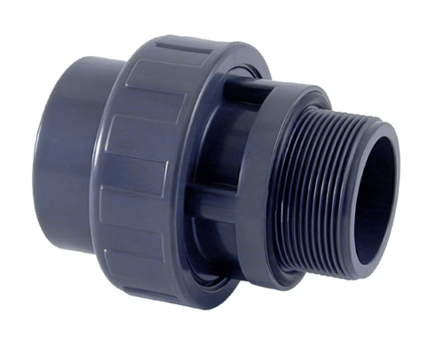 Unionkoppling i PVC med 1 1/2″ utvändig gänga på ensa sidan och limmontage på andra sidan.