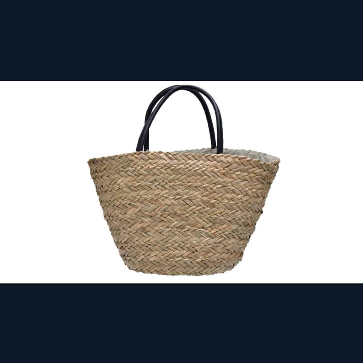 Vacker väska i flätat gräs med svarta handtag. Väskan har ett innerfoder av bomull med ett litet innerfack med dragkedja.